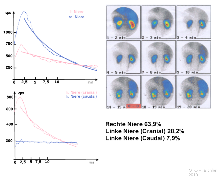 Renogramm oben: Über beide Nieren abgeleitete Zeitaktivitätskurven zur Funktionsbestimmung. Prozentualer Anteil (63,9%) gegenüber links (36,1%)