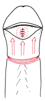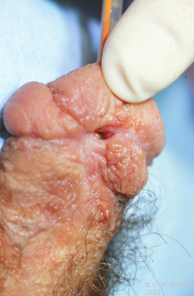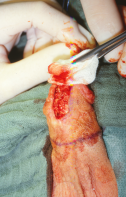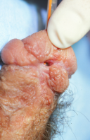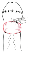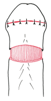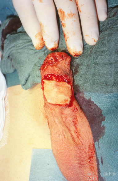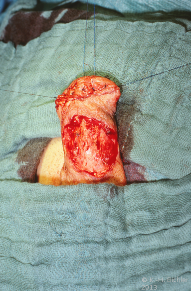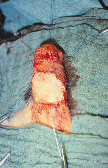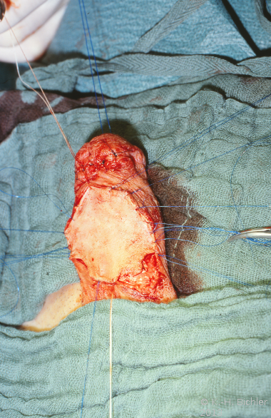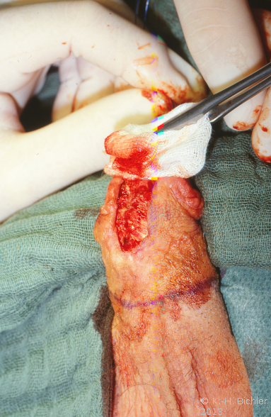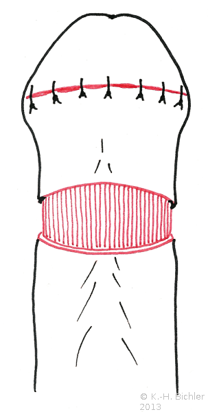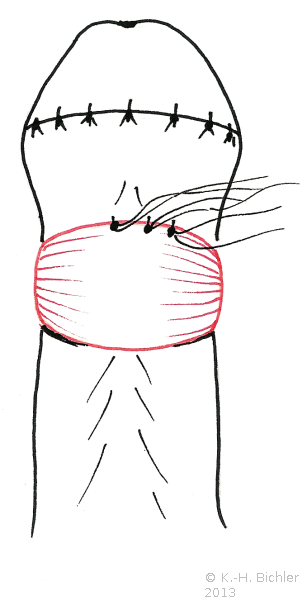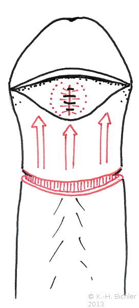 Insbesondere bei distalen Fistelbildungen in der Nähe der Corona glandis, einem Bereich, der beim Verschluss Schwierigkeiten bereitet, hat sich uns folgende Verschiebetechnik bewährt.