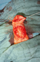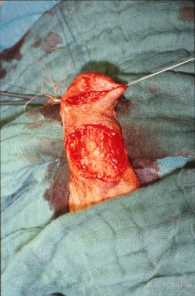 Operationstechnik nach Umschneiden der Fistel und primärem Nahtverschluss wird ein Verschiebelappen von proximal her mobilisiert und über die Naht gezogen. Fixation des Verschiebestückes an den distalen Schnittrand mit Einzelknopfnähten (Abbildung 3a-e).