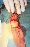 Der proximal entstandene Hautdefekt wird mit einem Spalthautlappen gedeckt (Abbildung 3f).