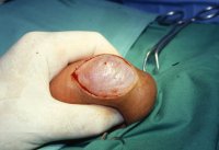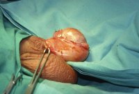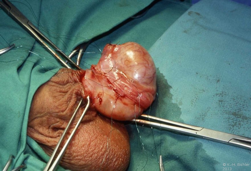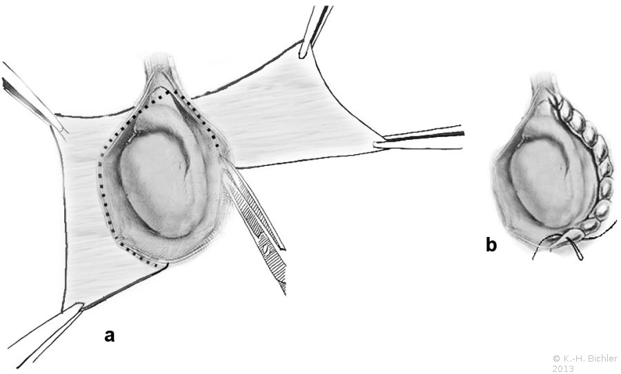 Ein Umschlagen der Hydrozelenränder (OP nach Winkelmann) bzw. Raffung der Hydrozelenwand (OP nach Lord) ist im Kindesalter nicht indiziert, birgt die Gefahr sekundärer Durchblutungsstörungen des Hodens (Abbildung 7).