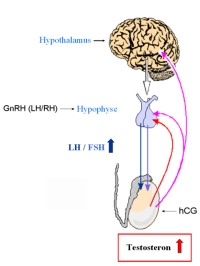 hCG besitzt überwiegend LH-Aktivität und stimuliert die Testosteronproduktion der Leydig-Zellen.