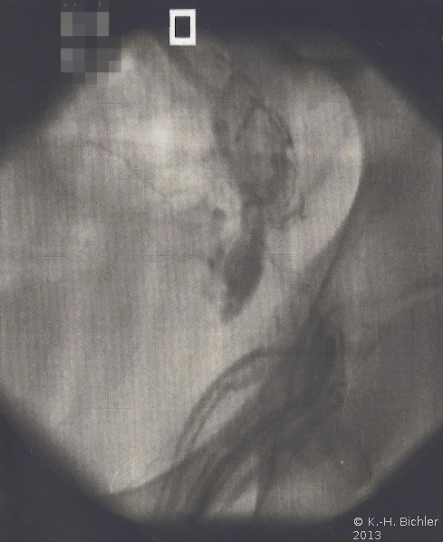 Phlebographie über eine Vene des Plexus pampiniformis. Nach Injektion von Kontrastmittel Darstellung mehrerer Kollateralen im Bereich der Beckengefäße, unter anderem zur Vena illiaca. Eine Sklerosierung wurde in Anbetracht der Kollateralen nicht durchgeführt (Abbildung HG1).