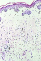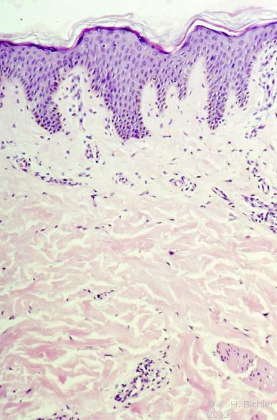 Histologisch findet sich beim Lichen sclerosus et atrophicans eine atrophische Epidermis, Sklerosierung und Ödem (Abbildung HG1).