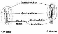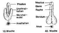 Die Differenzierung der männlichen Genitalorgane erfolgt durch drei Hormone: Testosteron, 5-α-Dehydrotestosteron, Müllerian-Inhibiting-Substance. Die Entwicklung des äußeren Genitale ist von einem ausreichend hohen Gehalt an 5-α-Dehydrotestosteron abhängig. Die fetale Androgensynthese erfolgt bis zur 14. Woche über das mütterliche Choriongonadotropin. Fehlbildungen in dieser Zeit führen zu Mikropenis bzw. Hypospadie. Ab der 18. Woche wird die Entwicklung durch das fetale LH gesteuert. Im Normalfall beträgt die Penislänge bei der Geburt ca. 3,5 cm.