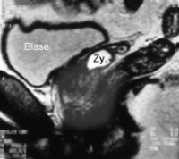 Der jüngere Erwachsene kam wegen Unterleibsschmerzen und Dysurie in Behandlung. Es fanden sich ein Harnwegsinfekt sowie eine rezidivierende Nebenhodenentzündung rechts. Trotz Antibiotikabehandlung entsprechend Keimtestung blieben die rechtsseitigen Unterleibsbeschwerden bestehen. Die Sonographie ergab Verdacht auf eine Raumforderung im rechten Samenblasen-Prostata-Bereich. Im MRT fand sich eine rechtsseitige Zyste der Samenblasen (bzw. Müller-Gang-Zyste) (Abbildung 6).