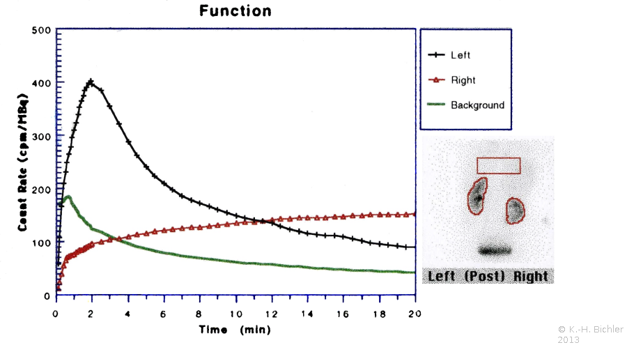 Die junge Frau kam wegen der beim Allgemeinarzt festgestellten Hypertonie (220 zu 120) und rechtsseitigem Harnstau in der Sonographie zur urologischen Abklärung. Im Isotopennephrogramm zeigte sich eine ausreichende Gesamtfunktion beider Nieren mit einer kleinen rechten Niere und entsprechend reduzierter Partialfunktion: Rechts zu links wie 72 zu 28. Beim Lagewechsel vom Liegen zum Sitzen zeigte sich keine Durchflutungsänderung bei erkennbarer rechtsseitiger Nephroptose. In der retrograden Sondierung fand sich auf der rechten Seite eine Ureterabgangsstenose, die eine Nierenbeckenplastik nach Anderson-Hynes erforderte sowie in gleicher Sitzung eine Nephropexie der rechten Niere (Abbildung 18).