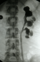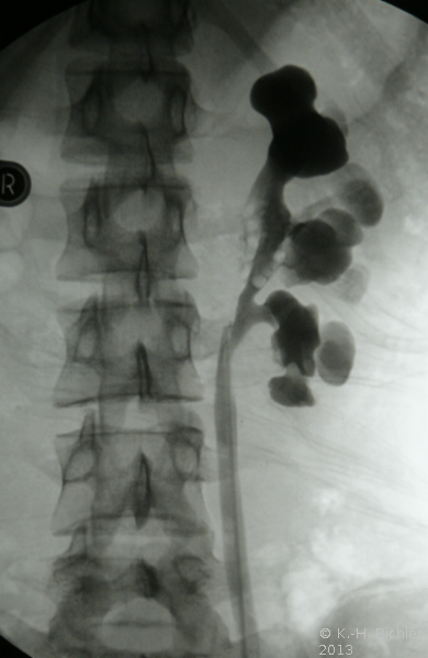 Zur weiteren Diagnostik gehört das Miktionszysturethrogramm (MZU) um insbesondere bei den II-gradigen Hydronephrosen einen Vesikoureteralen Reflux zu erfassen (Abbildung 4).
