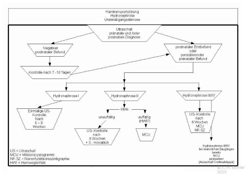 Die prä- bzw. postnatale Diagnostik der Dilatation des Harntraktes zeigt der Algorithmus (Abbildung 4).