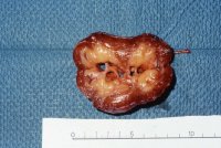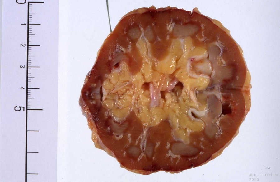Aber wie auch in unserem Beispiel (s. Abbildung 21) zu erkennen, finden sich dabei häufig Veränderungen, die in die pyelonephritische Richtung gehen. Die pyelonephritische Schrumpfniere weißt deutliche Narben auf, die zum Teil bis in das Markgewebe reichen. Die Oberfläche ist großbucklig, das Parenchym zum Teil nur in Resten vorhanden und das Nierenbecken narbig verdickt. Das Hilusfettgewebe ist vermehrt ("Vakatwucherung") (Abbildung 23) (s. "Pyelonephritische Schrumpfniere").