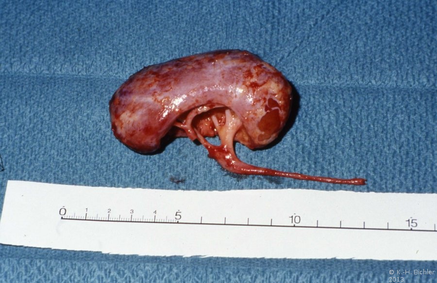 Als Beispiel die kleine stumme Niere bei einem Mädchen. Anhand des Nephrektomiepräparates war die Differentialdiagnose pyelonephritische Schrumpfniere oder Hypoplasie bzw. eine Kombination nicht mehr möglich (Abbildung 22).