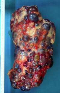 Im Vollbild der Erkrankung z.B. asymmetrische Nierenvergrößerung mit Zysten variabler Größe (wenige Millimeter bis mehrere Zentimeter). Es besteht ein nebeneinander von normalen und zystisch erweiterten Nephronen. Die Lokalisation der Zysten kann alle Nephronabschnitte betreffen. Die Nieren haben makroskopisch ein höckeriges Aussehen (Abbildung 3).