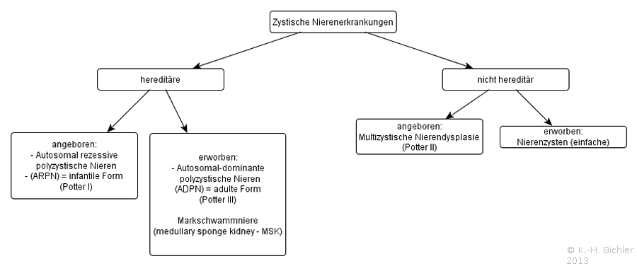 Das Krankheitsbild der doppelseitigen Zystennieren ist zwar eine Einheit, muss aber wegen der morphologischen Unterschiede und mit Rücksicht auf die Klinik in solche des Kindes- (ca. ¼) und Erwachsenenalters getrennt werden (Abbildung 2).