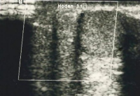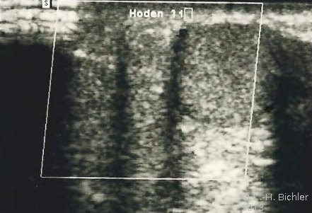 14 Jahre alter adipöser Junge mit Gynäkomastie. Palpatorisch fanden sich kleine, präpubertäre Hoden von jeweils zwei Millilitern Größe. In der Sonographie ein homogenes Binnenreflexmuster (Abbildung 4).