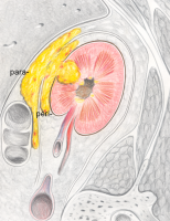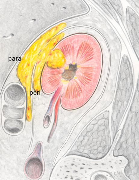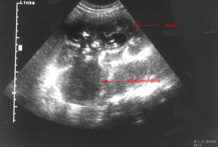 Ausgehend von einem Nierenabszess kann es zum Übertritt der pyogenen Infektion in den peri- bzw. paranephritischen Raum kommen. Die Pathogenese des peri- bzw. paranephritischen Abszesses zeigen die Abbildungen (Abbildung 5, s. auch Abbildung 4). Ein wichtiges, erstes Diagnostikmittel ist neben den entsprechenden Laboruntersuchungen bei der Ausbreitung der Abszedierung über die Niere hinaus die Sonographie.
