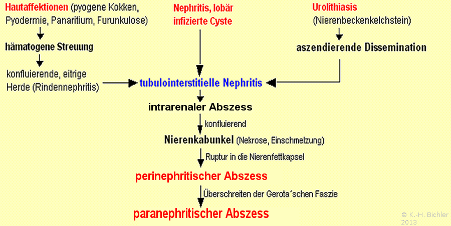 Die Pathogenese der Abszessbildung in der Niere und weitergehend in der Ausbreitung der pyogenen Infektion in den peri- bzw. paranephritischen Raum sind in der Abbildung dargestellt (Abbildung 5, s. auch Abbildung 4).