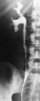 Akute nekrotisierende E. coli-Infektion. Dabei kommt es durch die Glukose spaltenden Bakterien zur Gasentwicklung im Nierenparenchym. Bei den Patienten liegt häufig ein Diabetes vor Literatur:Schainuck, L. I. et al: "Emphysematous Pyelonephritis", Amer J Urol, 44, 134-139, 1968. Diese Form der Pyelonephritis kommt auch im Kindes- und Jugendalter vor. Das Krankheitsbild ist gekennzeichnet von Bauchschmerzen und Fieber. Die Erkrankung tritt akut mit Zeichen der Allgemeininfektion auf. Im Ausscheidungsurogramm findet sich eine Gasfüllung der ableitenden Harnwege (Abbildung 14).