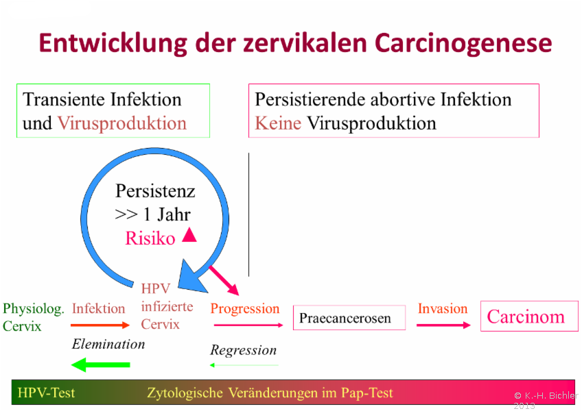 Dabei besitzen diese onkogenen, sogenannten High Risk-Typen, die Eigenschaft bei einigen Frauen, nach einer auf mindestens 7-8 Jahre geschätzten, meist aber 15-20 jährigen Latenzzeit ein invasives Karzinom zu induzieren (Abbildung HG1).
