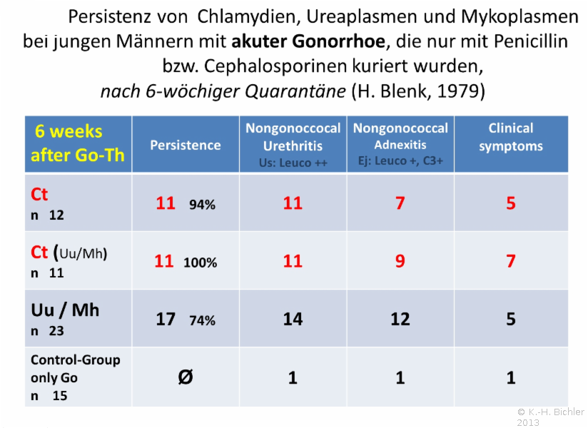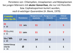 Ureaplasma urealyticum, Gardnerella vaginalis und Ureaplasma parvum persistieren in der Urethra, wie in der Studie von Bradshaw et al. nachgewiesen wurde, länger als 14 Tage. Blenk fand für diese Erreger eine Persistenz von mindestens 6-Wochen bei Soldaten (Abbildung HG1) Literatur:Blenk, H.: "Diagnostik und Therapie der nichtgonorrhoischen Genitalinfektionen", Urologe B19, 1609 -1611 (1979)