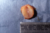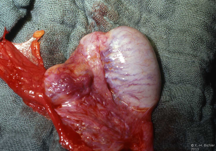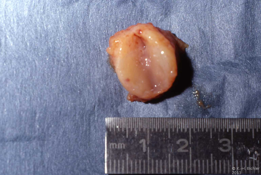 Bei dem jüngeren Erwachsenen war eine umschriebene Verhärtung bei der Palpation und ein tumorverdächtiges Areal in der Sonographie aufgefallen (Abbildung HG1). Die Hodenfreilegung und Entnahme einer Gewebsprobe ergaben in der histologischen Untersuchung ein Seminom sowie Seminoma in Situ (s. Abbildung 3).