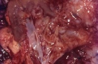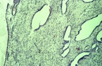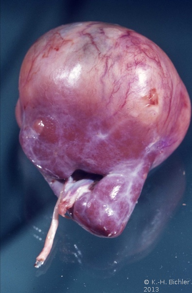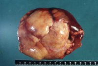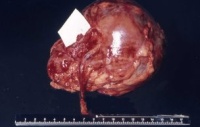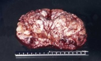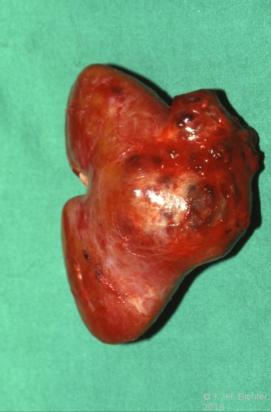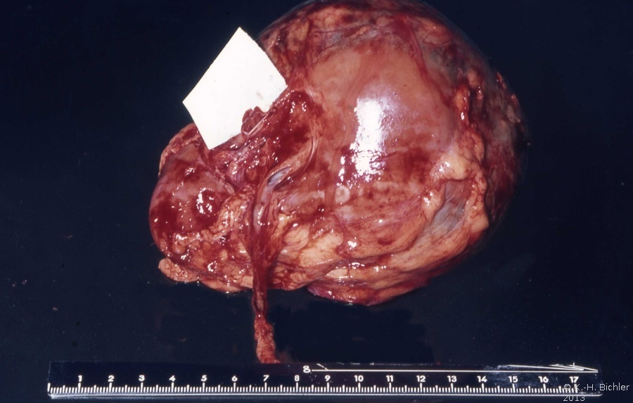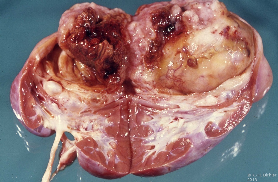Auf der Schnittfläche ist der Tumor von gelbbrauner bis grauer Farbe mit einzelnen Einblutungen. Zystische Anteile und Nekrosen kommen vor sowie oberflächlich glatte, knotenförmige Strukturen, ähnlich einem Rhabdomyosarkom (Abbildung 1a-d).