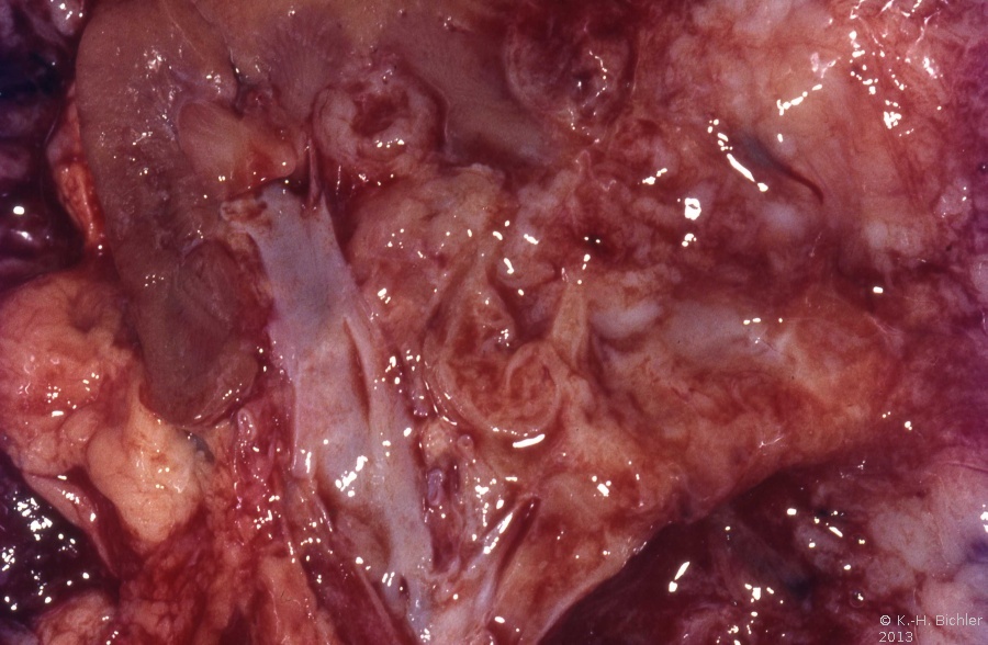 Das mesoblastische Nephrom wird im Säuglingsalter im 3.-6. Monat entdeckt, zumeist durch einen Oberbauchtumor Literatur:Richmond, H. et al: "Neonatal Renal Tumors", J Pediatr Surg, 5, 413-417, 1970. Der Tumor ist oberflächlich glatt, z.T. bucklig, von weißgrauer Farbe (s. Abbildung 1d). Ein von der Makroskopie her vergleichbares Bild wie bei dem Wilmstumor des 8 Monate alten Mädchens. Histologisch unterscheidet sich das Nephrom vom Wilmstumor, der zumeist ältere Kinder betrifft. Es finden sich dicht verflochtene Bündel von Spindelzellen mit elongierten Kernen, die das renale und perineale Gewebe infiltrieren, Einschlüsse von Glomeruli und Tubuli in das Tumorgewebe sind häufig. In wie weit das mesoblastische Nephrom zur Gruppe der Wilmstumoren gehört, ist fraglich. Die Prognose des mesoblastischen Nephroms ist gut. Metastasen sind selten