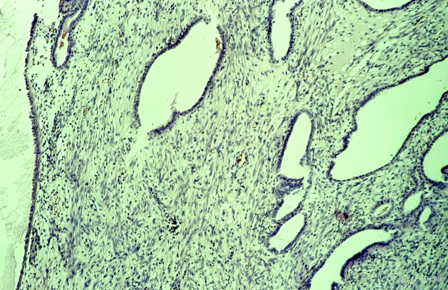 Mikroskopisch ist der Wilmstumor gekennzeichnet durch Gewebe, das verschiedenen Stufen der Nephrogenese entspricht. Es finden sich blastemische, stromale und epitheliale Zelltypen. Zum epithelialen Anteil gehören Strukturen, die tubulär oder glomerulär aufgebaut sind. Fibrozyten und myxoide Formen gehören zu den stromalen Gewebsarten. Auch glatte Muskelzellen, Knorpel-, Fett- und neurales Gewebe finden sich. Grundsätzlich ist festzuhalten, dass der Wilmstumor histologisch heterogen bzw. triphasisch aufgebaut ist. Die Anteile der Komponenten sind verschieden und korrelieren mit der Malignität des Tumors (Abbildung 2).