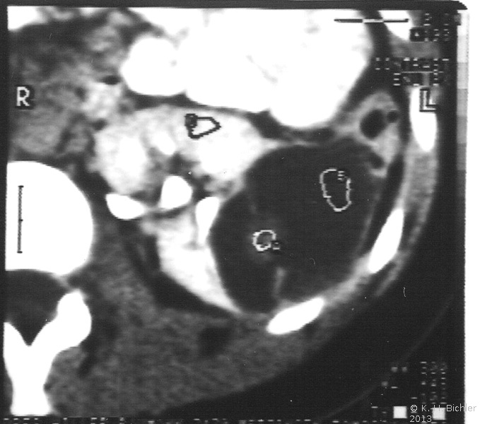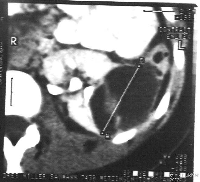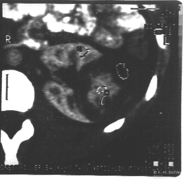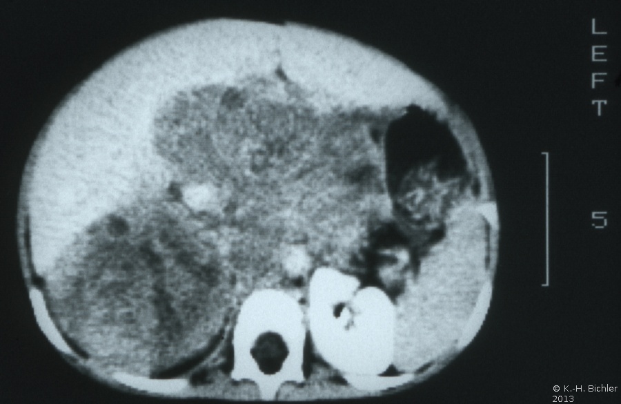 Die Computertomographie zur Bestimmung der Tumorausdehnung, zum Ausschluss einer zystischen Nierenfehlbildung (Differentialdiagnose) und zur Suche nach einem eventuellen kontralateralen Nierentumorbefall von Interesse. Außerdem dient das CT zur Flankierung der Chemotherapie (Ergebniskontrolle) (Abbildung 7,8,9).