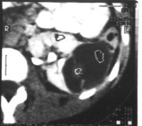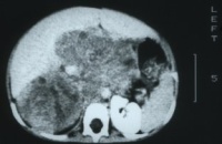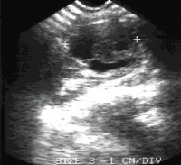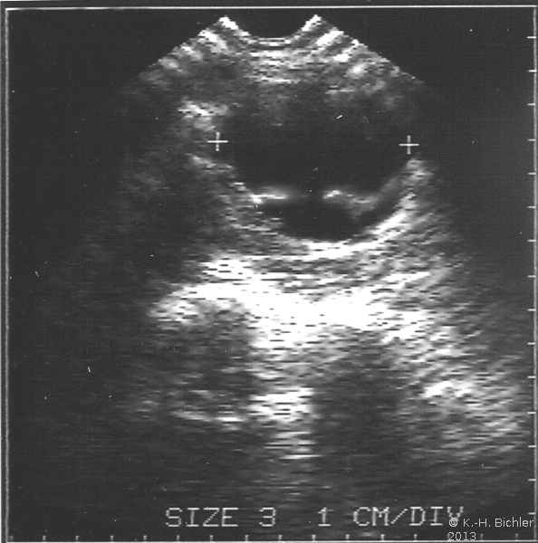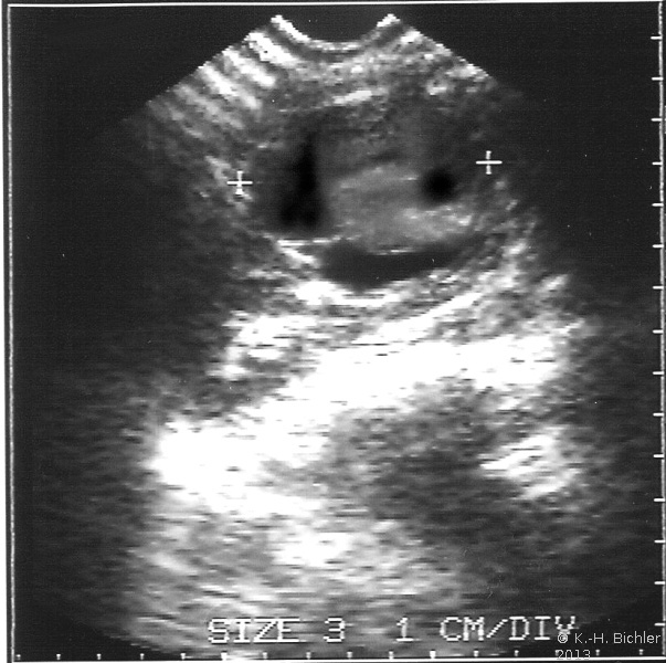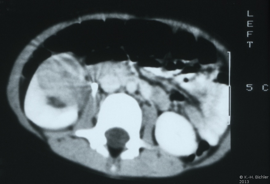 Am Beginn der Diagnostik steht die Sonographie (Abbildung 6). Neben dem Tumornachweis und der Zugehörigkeit zur Niere ist der Nachweis einer eventuellen Tumorinvasion in die Nierenvene (u.U. im Rahmen einer farbkodierten Dopplersonographie) bzw. in die Vena Cava inferior von Interesse. Immerhin bricht der Tumor in 11% in die Nierenvene und zu 6% in die Vena Cava ein, selten bis in das rechte Atrium (s. auch Abbildung 1c) Literatur:McMahon, D.R., Kramer, S.A.: "Paediatric Urological Oncology" in Whitfield, H.N. et al: "Textbook of Genitourinary Surgery", Second Ed., Blackwell Science Oxford, 1998.