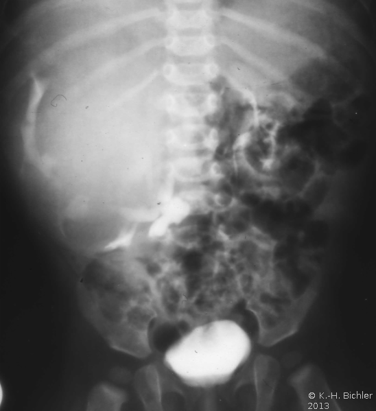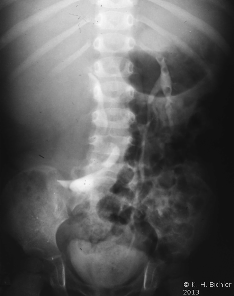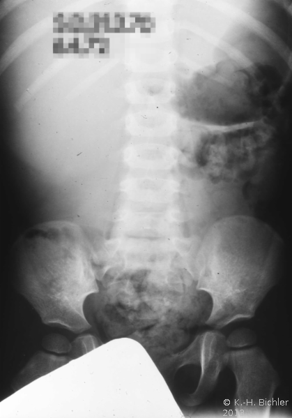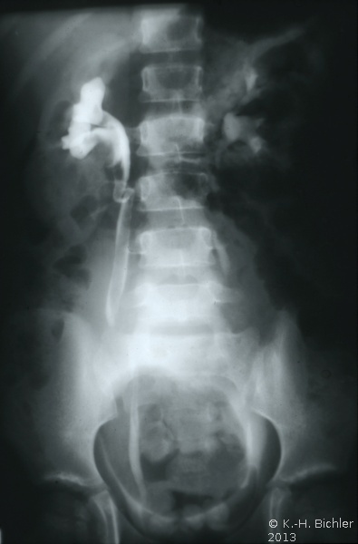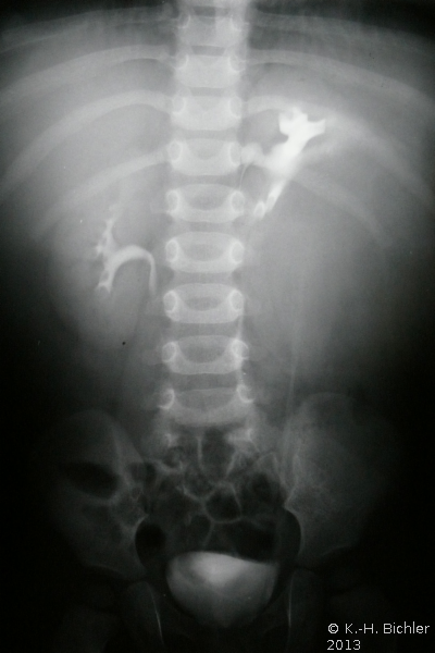 Die abdominale Sonographie bzw. die Computertomographie haben die Ausscheidungsurographie als die bildgebende Untersuchungstechnik bei Patienten mit Oberbauchtumor, z.B. Wilmstumor, verdrängt. Einige Ausscheidungsurographien von Kindern mit Wilmstumoren aus unserer Sammlung aus den 70er Jahren des vergangenen Jahrhunderts sind aus didaktischen Gründen hier wiedergegeben. Die Bilder zeigen instruktiv die Größe und Verdrängung durch den Tumor (4 Abbildungen HG1).