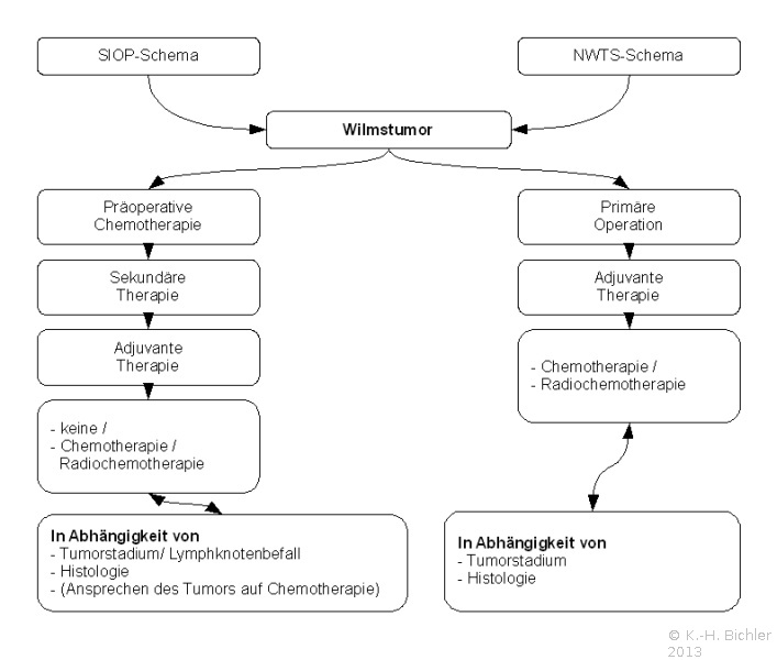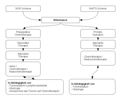 Die Behandlungskonzepte unterscheiden sich gemäß der NWTS bzw. der SIOP. In beiden Arbeitsgruppen werden im Rahmen aufeinander aufbauender Studien die Therapiekonzepte optimiert. Ziel ist eine risikoadaptierte Therapie, die high-risk-Tumoren ausreichend aggressiv behandelt und unnötige Therapiekomponenten bei niedrigem Risiko vermeidet. Nach NWTS-Protokoll wird nach primärer Operation eine kombinierte Chemotherapie, in Abhängigkeit vom Tumorstadium zusätzlich eine Radiatio durchgeführt. Nach SIOP Schema steht an erster Stelle eine präoperative Chemotherapie gefolgt von Operation und kombinierter Chemotherapie, ggf. Radiatio (Abbildung 11).