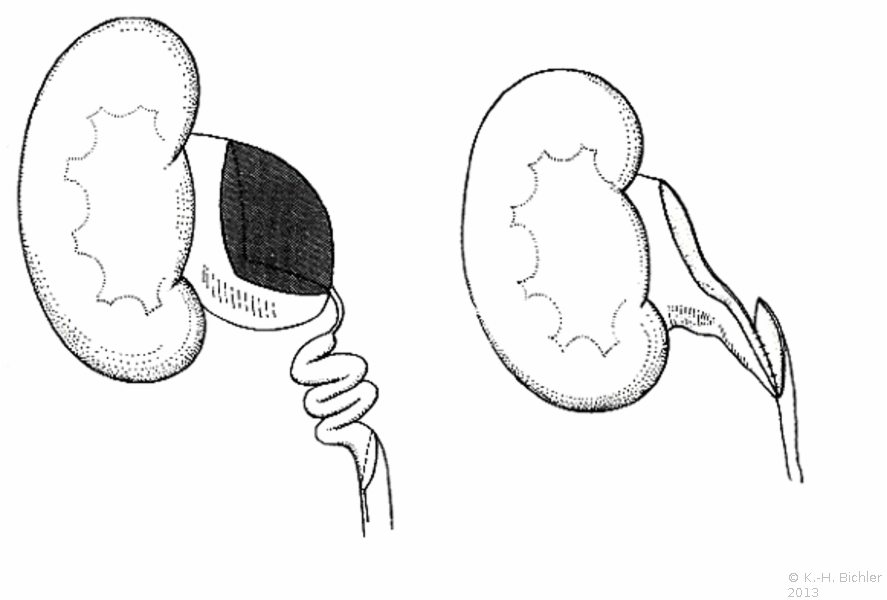 Ausgehend von einem Flankenschnitt (Intercostal) Freilegung des Nierenbeckens und Darstellung der Ureterabgangs (Engstellung, Taillierung), Resektion des Nierenbeckens und der Harnleiterengstelle. Naht des spatulierten Harnleiters an das resizierte und mit Naht verschlossene Nierenbecken (Abbildung HG1). (s. Fehlbildungen der Nieren und der ableitenden Harnwege).