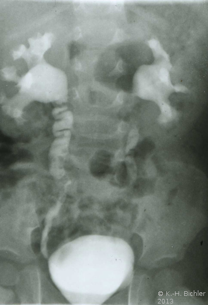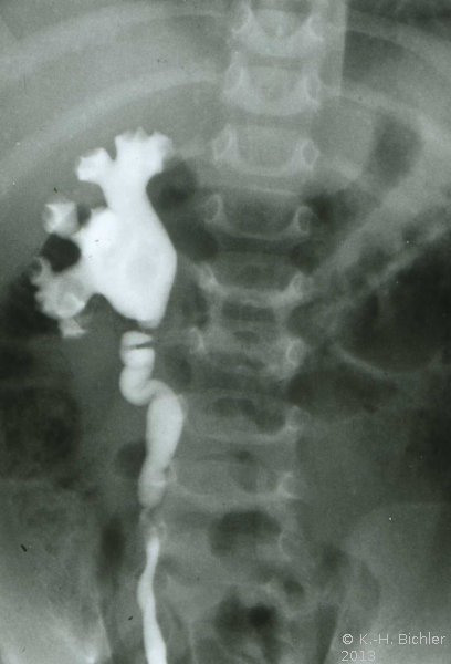 Als Beispiel die Ureterabgangsstenose bei multiplen Nierenbeckenkelchsteinen eines 2 Jahre alten Jungen (Abbildung HG2).